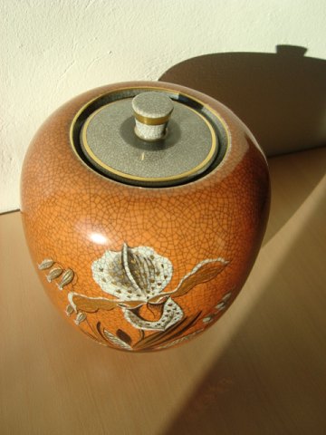 Bagsiden dekoreret med liljekonval og mamelukblomst eller trompetblomst.