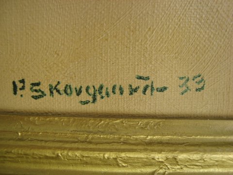 Spændende maleri af Peter Skovgaard, der var søn af maleren Joakim Skovgaard (1856-1933). Peter Skovgaard var mest kendt for sine fugle skitser - han var uddannet ornitolog. Skovgaard lavede også flere portrætter samt blomster billeder. Ligeledes kopierede han flere af sin fars værker og de bruges den dag i dag som altertavler rundt om i landets kirker.