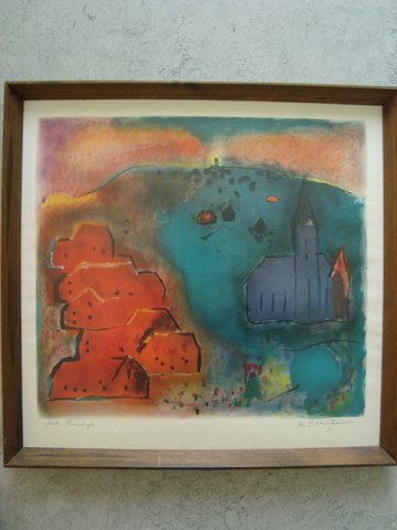 Text available in Danish: Første prøvetryk - Kai E. Christiansen - Landskab med gårde og kirke.
