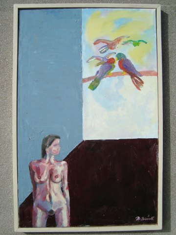 Maleri af Per Briann 1987 - Komposition med nøgen kvinde og papegøjer.