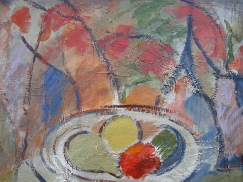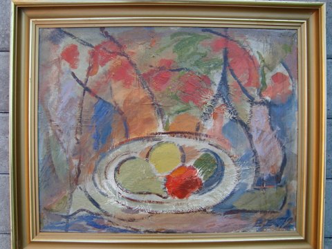 Maleri af Erling Enger - Opstilling med frugtfad og blomster 1972.