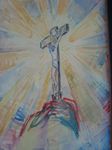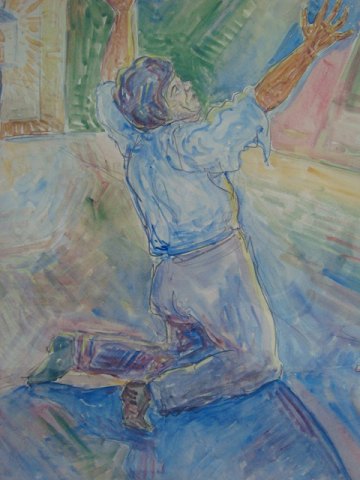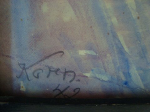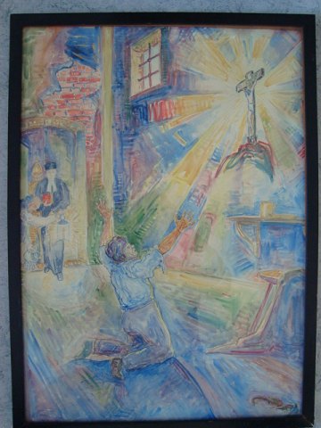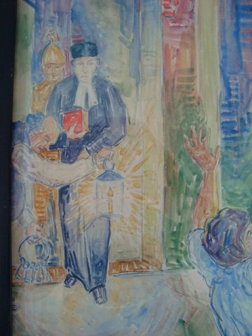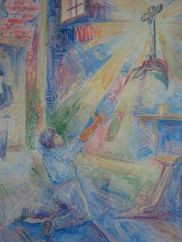 Akvarel af H.J. Korn 1942 - Ung mand der beder ved alter i kirke.