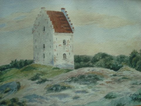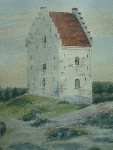 Akvarel af "Den Tilsandede Kirke" Skagen 1948 af Ella Heide.