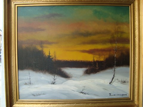 Maleri Finn Dannerfjord - Solnedgang over vinterskov.
