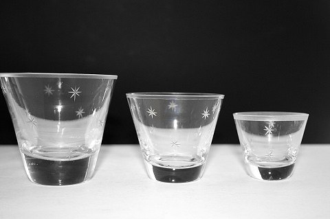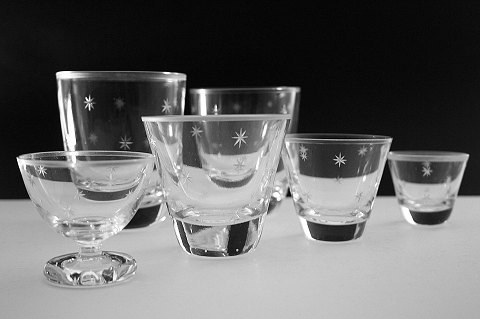 Holmegaard, Mars studsglas drinksserie med spredte slebne stjerner og sleben kant. Designet af Per Lütken og produceret fra 1943-60. Sjælden udbudt.