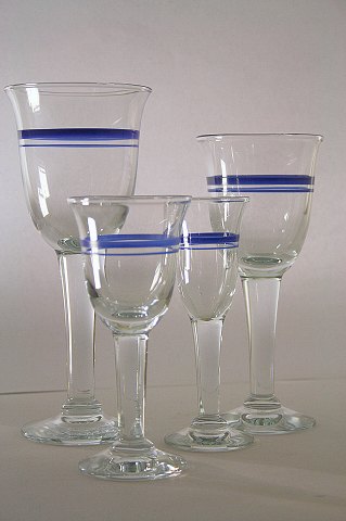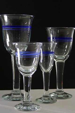 Holmegaard glasværk, Blå klokke glas. Designet af Ole Winther, 1974-90. Dette er en oversigt over de forskellige typer glas i Blå Klokke. Klik på linket: www.susantik.dk/katindex.asp?kukat=4331 og klik derefter på de separate fotos af de enkelte glas for at se pris og antal.