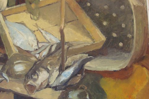 Maleri med opstilling med fisk, fiskeredskaber og -kasser 1952.