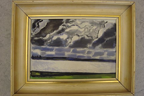 Maleri af Th. Hagedorn-Olsen - Grøn/blåt lanskab fra Roskilde Fjord.