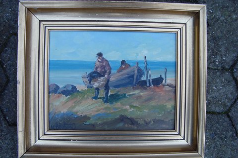 Maleri af Knud Bøstrup - Fiskere kommmer ind med fangst.