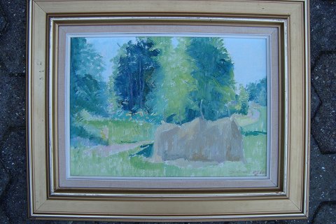 Maleri af Jørn Glob - Lysegrønt landskab med høstak.