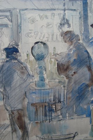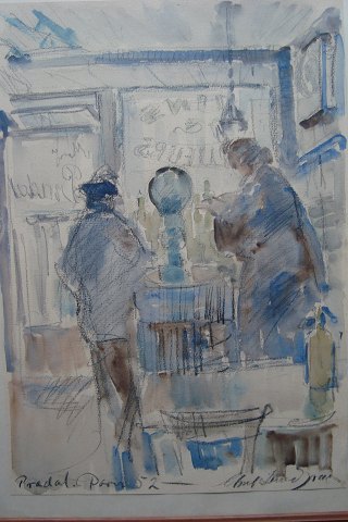 Akvarel af Aksel Lundgreen - Hos spåkonen Mme Pradal, Paris 1952.