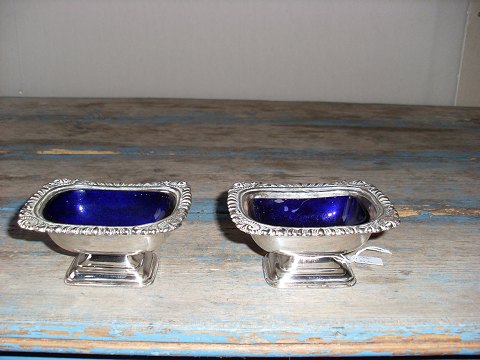 Par forsølvede engelske saltkar med blå glas indsats.