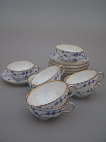 8 Stk. Kgl Musselmalet riflet Moccakopper m. guldkant og underkopper H:3,5cm. D: 7,5cm.