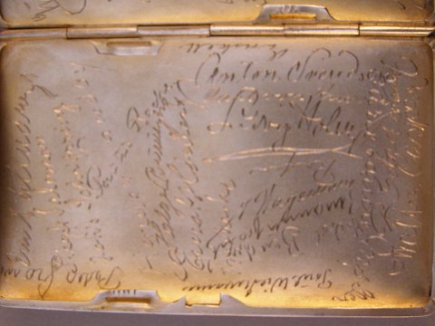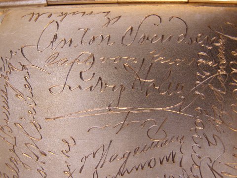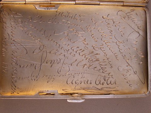 Text available in Danish: Cigaretetui i sølv med mange autografer