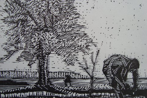 Text available in Danish: Linoleumstryk af Poul Skov Sørensen 1981 - Arbejdende kvinde i landskab.