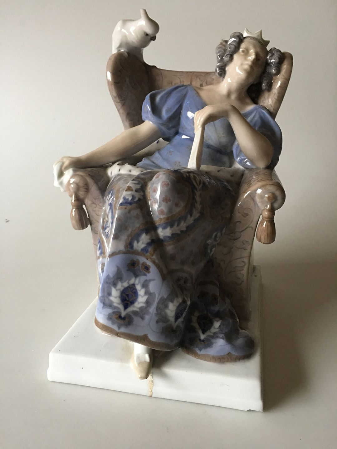 Royal Copenhagen Figur Dronning No 1494. Måler 25 cm. Designet af Christian Thomsen. Figuren har en reparation nede omkring foden, hvor den har været revnet. Yderlige er der afslag to steder på papegøjen, der sidder på øreklappen. Og endelig er der et skår i det ene hjørne på soklen.