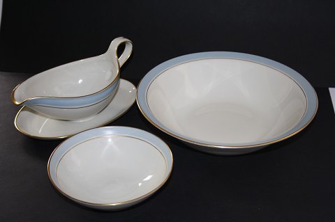 Kjøbenhavns Porcellains Maleri, Fredensborg. Designet før 1956. Stellet er elfenbensfarvet og dekoreret med lyseblå kant og mat guldkant. Alle i perfekt stand.