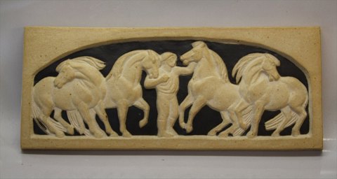 Dansk Stentøj B&G relief: Mand med heste 19 x 46 cm K. Otto