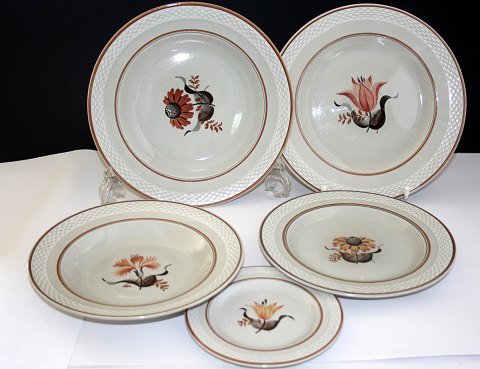 Aluminia, Kirsten dek.nr. 263. Grå fajance med brune kanter og 3 forskellige håndmalede blomster. Stellet er produceret i perioden 1933-67 og er designet af Nils Thorsson. Tallerkenerne er i perfekt stand, med ganske få undtagelser.