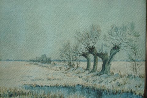 Akvarel af Jens Djelbo - Vinterparti med vådområde og stynede træer.