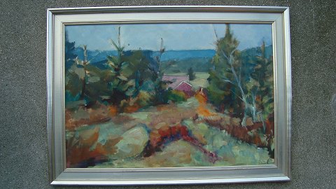 Maleri af Poul Bruun Jacobsen 1976 - Gård i landskab.