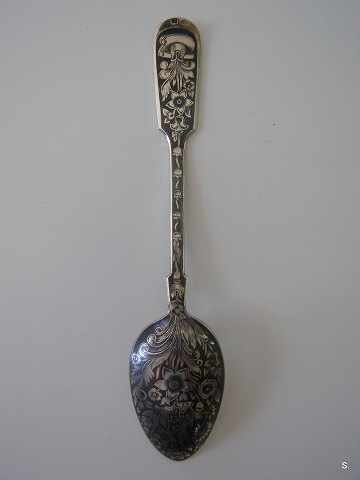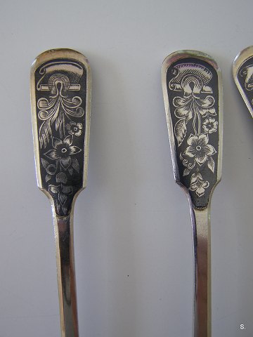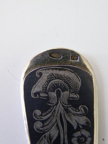 Russiske Dessertskeer rigt udsmykket niello på både for og bagside L:17cm. Uidentificerbar stempler