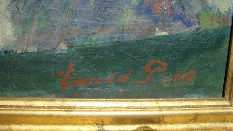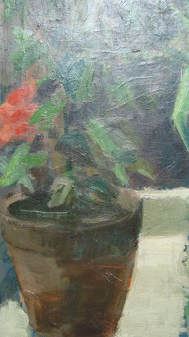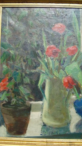 Maleri af Ewald Petersen 1948 - Opstilling med blomster med ymerskål i vindueskarm.