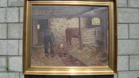 Maleri af Mouritz Nørgaard - Gammel mand og kat i stald 1960.