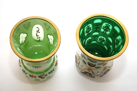 2 smukke Bøhmiske opalinevaser med indvendig grønt krystalglas, guldbort og guldstaferinger.