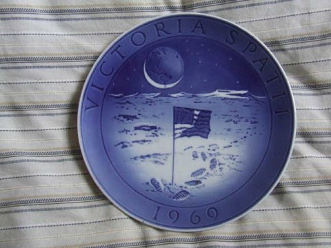 Måneplatte. Månelandskab med fodspor og amerikansk flag. Indskrift: VICTORIA SPATII 1969 (besejring af rummet). Fremstillet I anledning af amerikanske astronauters første landgang på månen. Tegnet af Sven Vestergaard