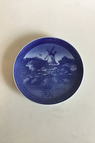 Genforeningsplatte. Dybbøl mølle, f. n. Slesvigs løver og årstal 1920-1970. Indskrift: NORDSLESVIGS GENFORENING. Fremstillet i anledning af 50-året for genforeningen. Tegnet af Kaj Lange. 20 cm.