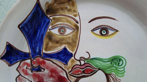 Spændende, stort, signeret bordfad/vægplakette med surealistisk dekoration.