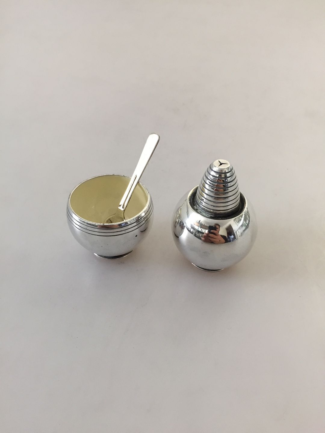 Hans Hansen Sterling Sølv Saltskål med ske og Peberbøsse