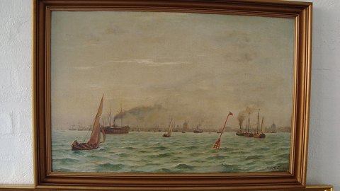 Maleri af Johan Neumann - Indsejlingen til København med Holmen, Frederiks Kirke mv.