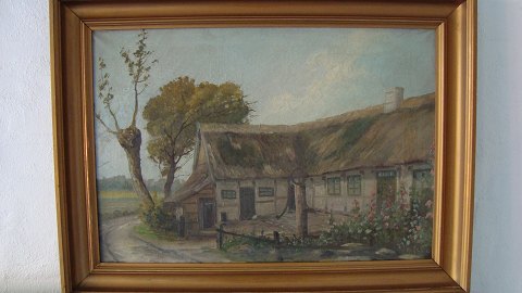 Bondegård med stråtækt tag, stokroser, vandpumpe og stynede træer.