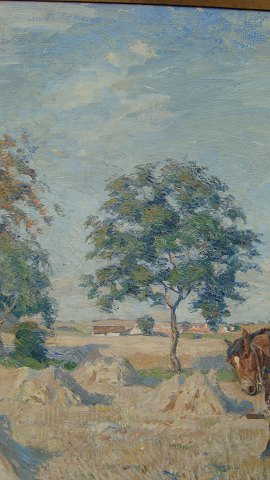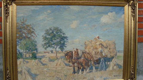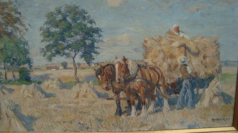 Høstscene med mand og kone ved hestevogn.