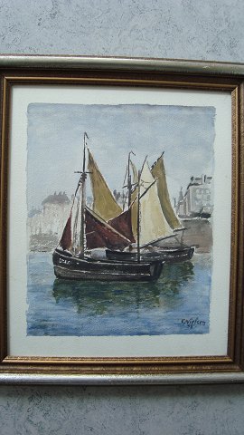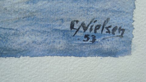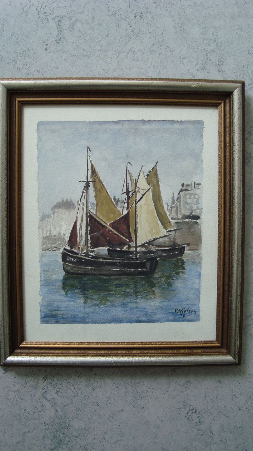Akvarel af C. Nielsen - skibe i havn 1953.