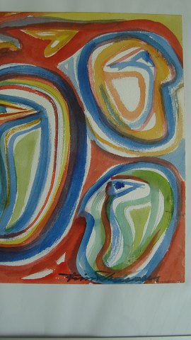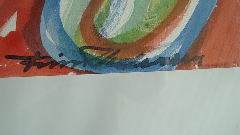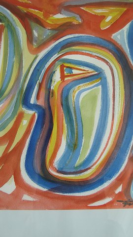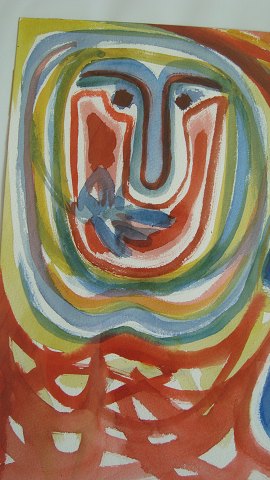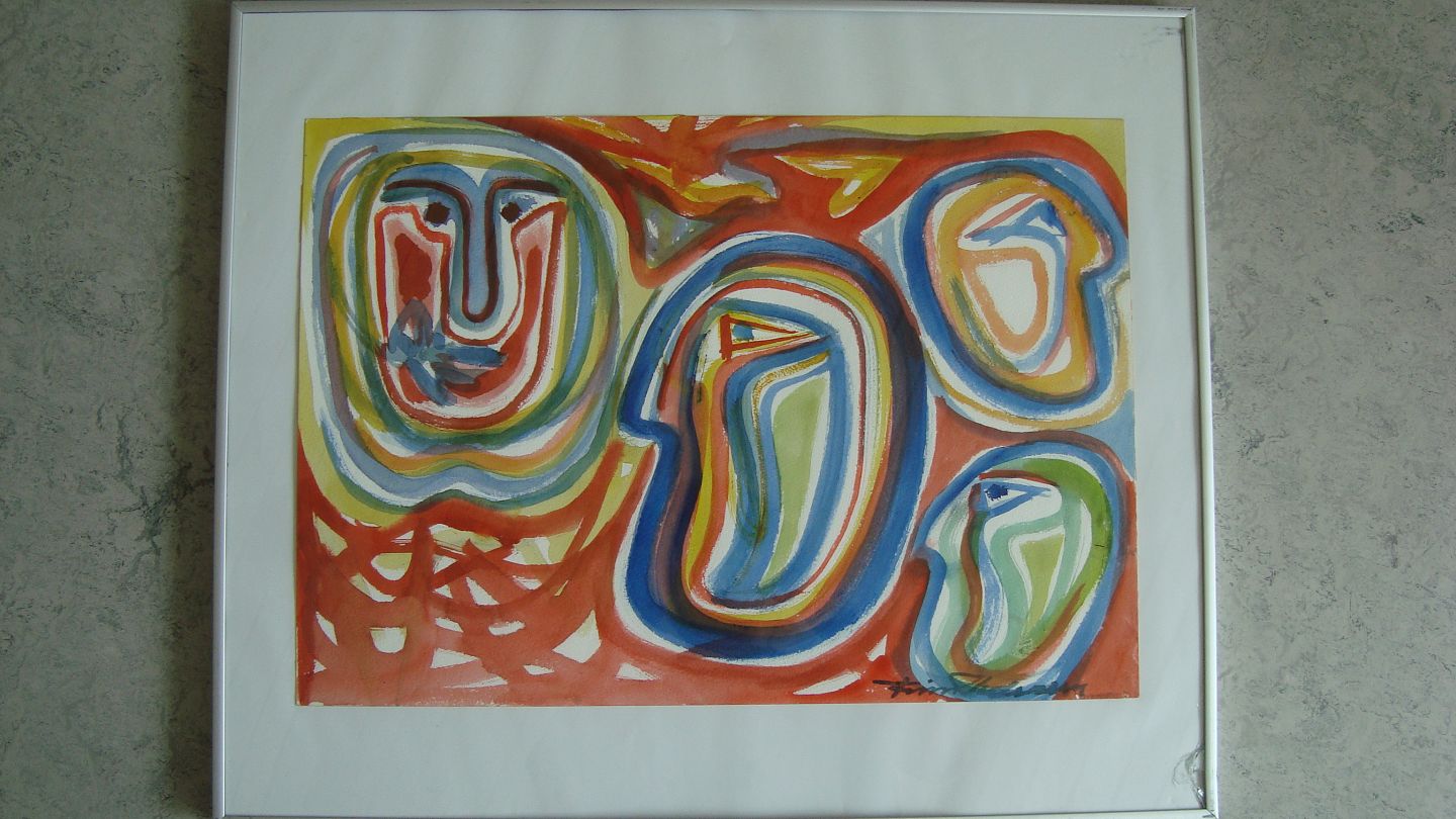 Akvarel af Finn Pedersen - Abstraktion med fantasivæsner og ansigter.