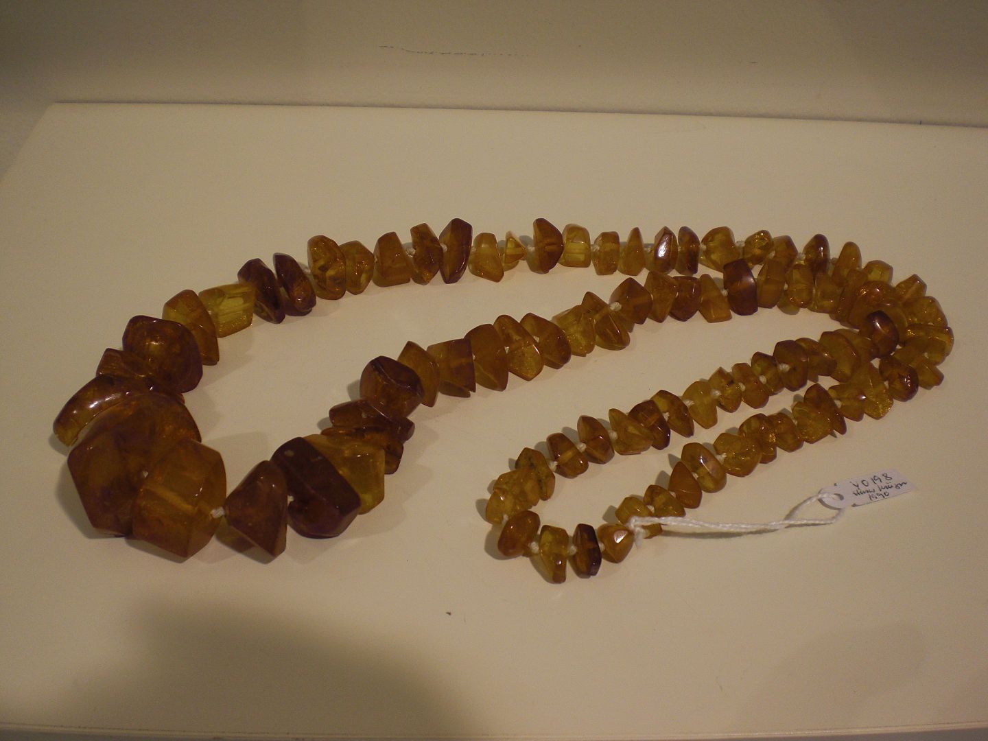 Ravkæde fra Hans Krüger design - Vandkunstens Guldsmed. poleret dansk gyldenrav. Længde: 2 x 40,5 = 81 cm. Vægt: 84 gram.