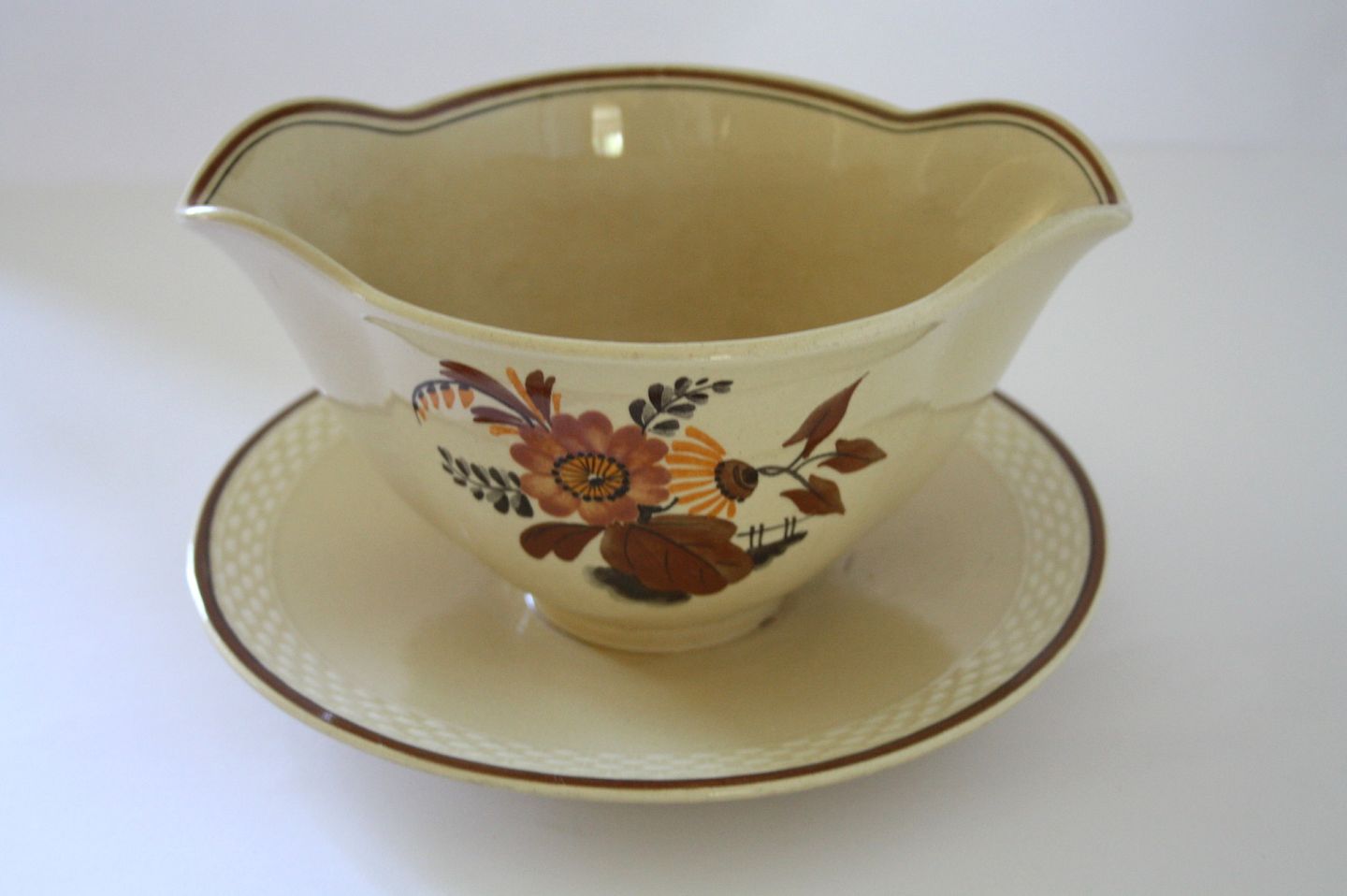 Aluminia fajance. Knud. Design Niels Thorsson. Håndmalet. Produceret i perioden 1934-1963. Sovseskål. Diameter 20 cm. Højde 9,5 cm. Lettere overfladekrakelering. Pris: 250 kr. stk. Lager: 2