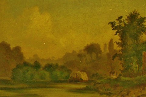 Ubekendt dansk guldaldermaler, 19. årh. Landskab med en båd på en flod. Usigneret. Olie på papir monteret på pap. 17½ x 26 cm. Påskrevet E. M. Jensen på bagsiden, for Edvard Michael JENSEN (1822-1915). I god stand, trænger til rens. Rammen er 2½ cm. bred.