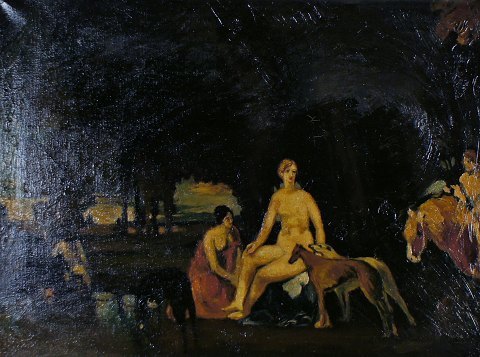 Olie på lærred, usigneret, ubekendt kunstner. Nøgne kvinder i landskab. Ca. 1900.