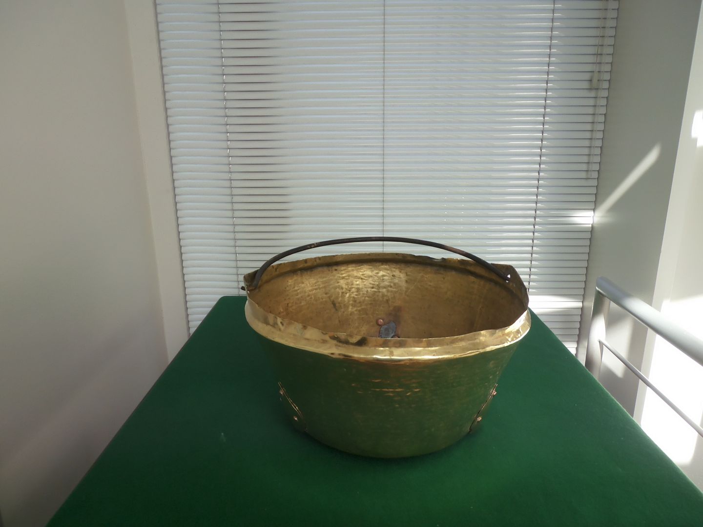 Brass Flensborg bucket with original iron handle, minor restoration, Denmark approximately 1860.