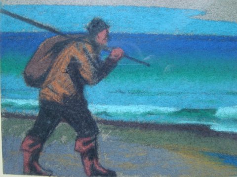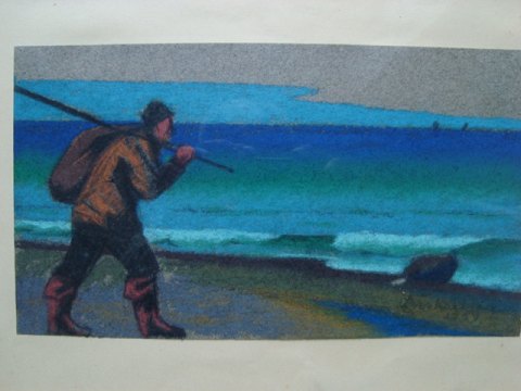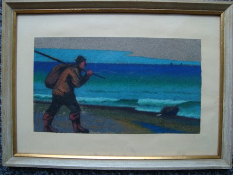 Pastel af Lars Nielsen - Gående fisker på stranden 1959.