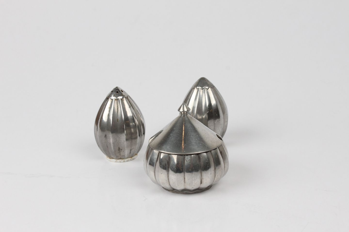 Fint lille tin sæt salt, pebber og sennepskrukke
