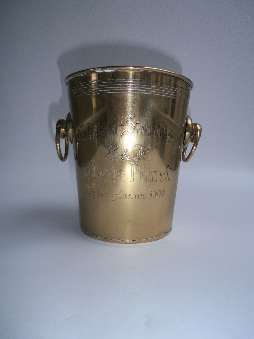 Wine cooler in Brass from "Vinhuset Svendborg" - following text is engraved at the front of the cooler, "Vinhuset Svendborg, P&H, Calorie Punch, Diplom Aarhus 1909" 18 cm. high and 16 cm. wide.