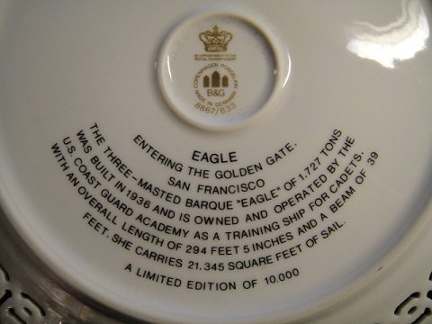 motiv Full-Rigged " Eagle" , U.S.A. er nr. 2 i en serie af 6 stk. windjammer Tallerkner / platte. nr. 8867 /633 Fremstillet af Bing & Grøndahl.