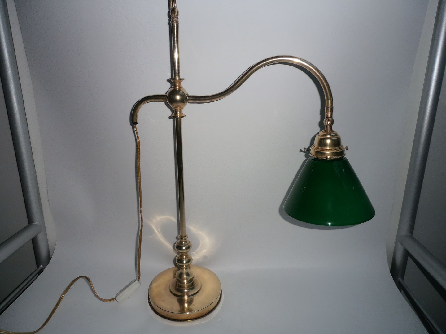 Kontorlampe i messing m. grøn glasskærm, Danmark ca. 1920.