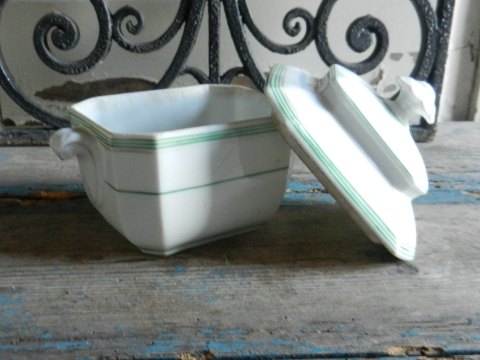 Fransk 1800tals sukker skrin, dekoreret i grøn og guld.