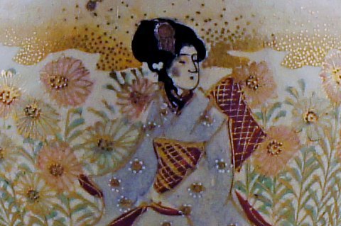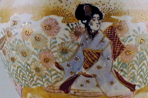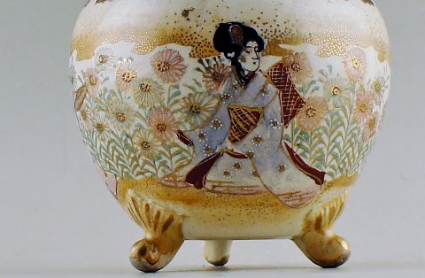 Satsuma fajance krukke med låg. Dekoreret med to kvinder i profil. Måler : 20 x 15 cm. Stemplet. Tidligt 20 årh.